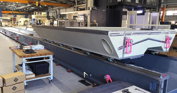 Mit den grossen Abmessungen (L: 16.3m / B: 1.8m / H: 2.5m) war unsere DMU 600 genau die richtige Maschine für die Bearbeitung. Damit die Führungsflächen genau fluchten, erfolgte die Bearbeitung im zusammengebauten Zustand.